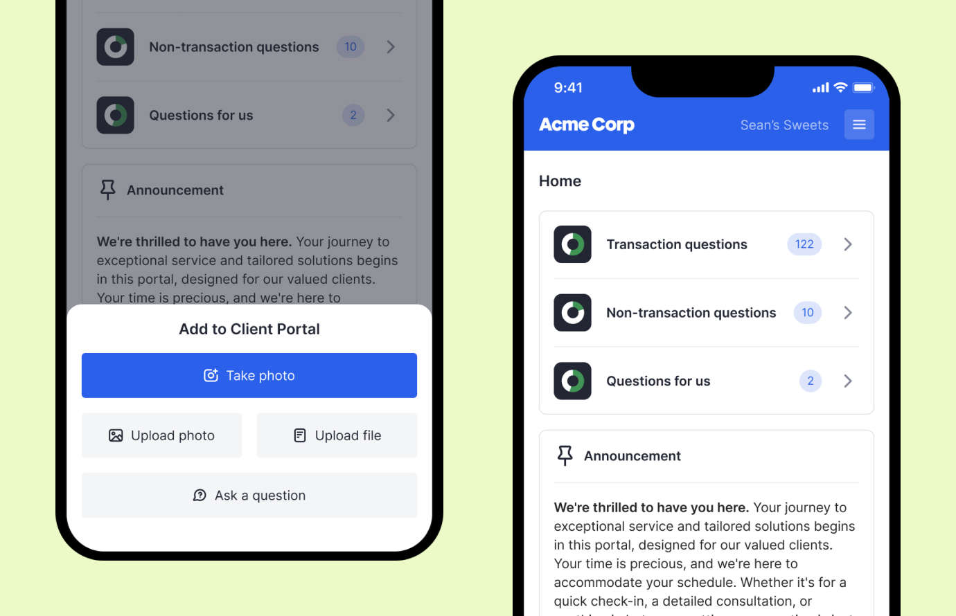 Give your clients the ability to communicate with you on the go. Clients can ask and answer questions, upload receipts, and even view their financials -- right in the palm of their hand.