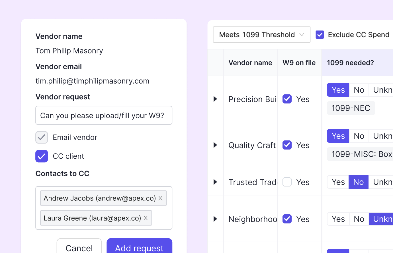 Generate reports to identify vendors that meet the 1099 criteria, and request missing W-9s directly from your clients or their vendors. After gathering the necessary documents, your team can quickly export the data to your favorite e-filing tool (like Track1099 or Tax1099.)
