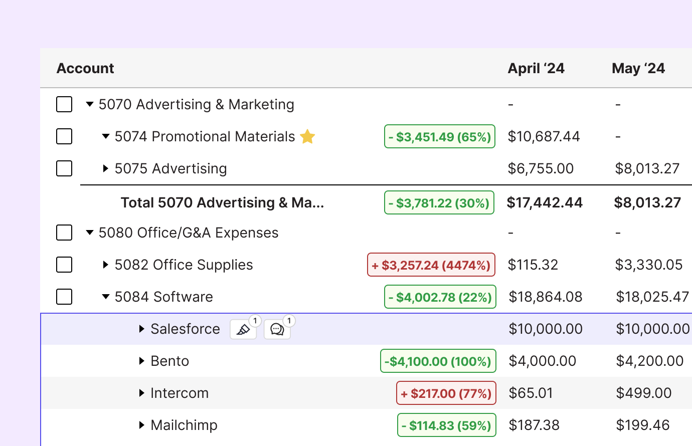 Drill down on individual transactions at the vendor level without opening up Excel, QuickBooks, or Xero. Identify cost drivers and variances so you can assess, budget, and advise your clients for their financial success.